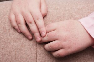 お子さんのアトピー性皮膚炎では、「気づいたら範囲が広がっていた」というケースが珍しくありません。子どもはかゆみを我慢しにくく、寝ている間に掻いてしまうことも多いため、短い期間でも見た目が変わりやすいことがあります。